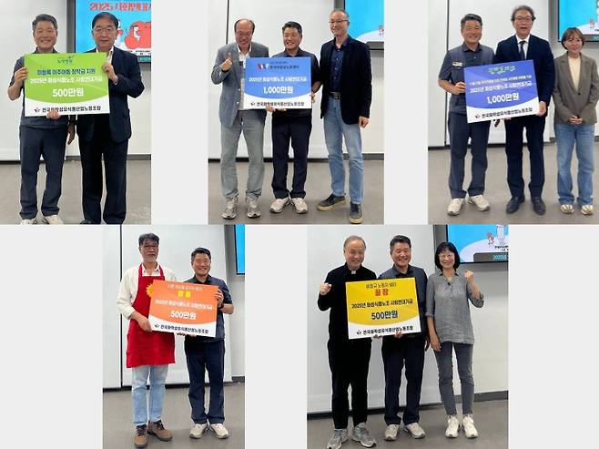 | ▲ 왼쪽 위부터 시계방향으로 녹색병원, 한국비정규노동센터, 전태일재단, 꿀잠, 밥통 관계자들이 공동전달식에 참여해 화섬식품노조 사회연대기금을 전달받았다. |