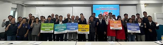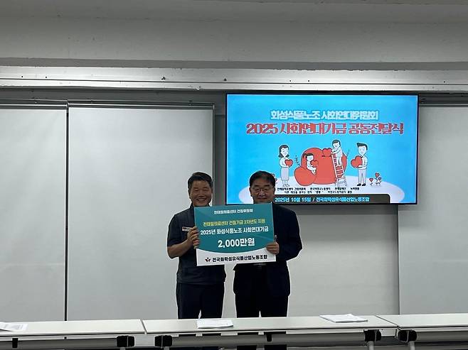 | ▲ 화섬식품노조가 10월 15일 조합 4층 대회의실에서 ‘2025년 화섬식품노조 사회연대기금 공동전달식’을 진행했다. |