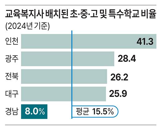 또한 경남의 교육복지사 1명당 담당 학생은 약 160명으로, 전국 평균보다 부담이 크다. 경남교육청에 따르면 2025년 기준 초등학교 525개교(학생 17만여 명)에 63명, 중학교 268개교(학생 9만여 명)에 35명이 배치돼 전체 793개교 중 700여 개교에는 전담 인력이 없는 상황이다. 이에 전국 평균보다 업무 부담이 크고, 복지 사각지대 학생을 세밀하게 돌보기 어렵다는 지적이 현장에서도 나온다.