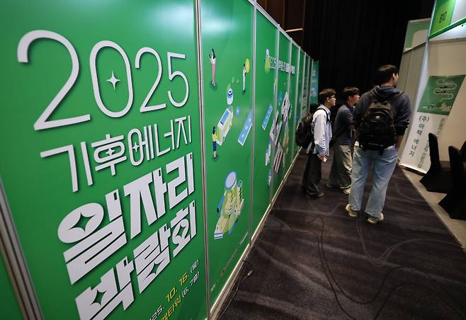 기후에너지환경부 주최로 16일 서울 서초구 엘타워에서 열린 ‘2025 기후에너지 일자리 박람회’에서 구직자들이 부스를 돌아보고 있다. 대기업·중소기업·공공기관 등 100여개 에너지 기업·기관이 참여했다.
