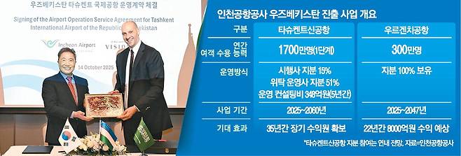 공사는 우즈베키스탄 정부와 '우르겐치공항 개발·운영 협약'도 체결했다. 지난 4월 우선협상대상자로 선정된 지 6개월 만이다. 타슈켄트에서 720㎞ 떨어진 우르겐치공항은 공사가 직접 지어 운영한다. 공항 건설·운영에 관한 의사 결정권을 100% 행사하기 때문에 국내 건설·엔지니어링 업체의 동반 참여가 가능하고, 공사의 수익 극대화도 기대할 수 있다. 공사는 3년간 약 300만명 규모의 신규 여객터미널을 건설한 뒤 직접 운영해 8000억원의 수익을 기대하고 있다.