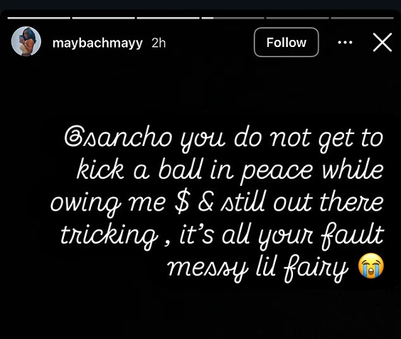 논란은 곧 산초를 향했다. 메이바크 메이는 추가 게시물에서 산초의 이름을 직접 거론하며 "그 역시 나에게 돈을 갚지 않고 있다"고 비난했다.