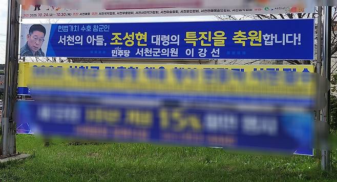 | ▲ 최근 충남 서천군에 있는 현수막 지정게시대에는 '조성현 대령의 특진을 축원'하는 현수막이 일제히 걸렸다. |