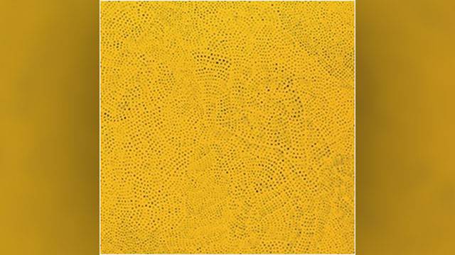 쿠사마 야요이의 ‘무한그물’(Infinity Nets)은 반복되는 그물망 패턴이 캔버스 전면을 넘어 측면까지 이어져 무한히 확장하는 듯한 공간감을 주는 작품입니다.