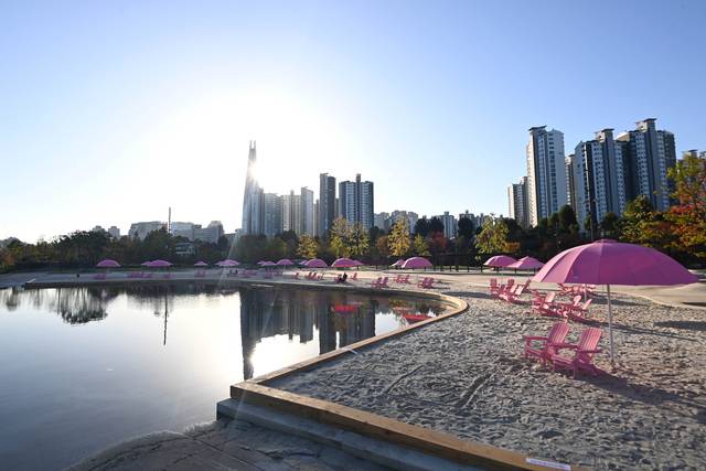 서울시가 여름철이 지나 문을 닫은 잠실 한강공원 물놀이장을 하얀 모래와 핑크색 의자·파라솔 등을 갖춘 ‘잠실비치’로 조성해 어린아이들과 부모 등 시민들의 큰 호응을 얻고 있다. 서울시는 여의도, 압구정, 잠실, 뚝섬 등 7곳에 한강을 보며 ‘물멍(물을 보며 멍하게 시간을 보내는 것)’을 즐길 수 있는 휴식 장소도 만들었다. 이용료는 모두 무료다.