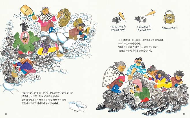 그림을 가만히 보고 있으면 눈이 시원해진다. 바위에 둘러앉아 굴을 캐는 사람들의 소박한 얼굴과 대비되는 원색의 옷차림이 겨울 바다의 추위를 오히려 강렬한 뜨거움으로 바꿔놓는다. 이윽고 귀가 열린다. 콕콕. 바위에 붙은 굴을 쪼는 소리, 파도 소리, 갈매기 울음소리에 오가는 말소리, 그 위로 파도처럼 경쾌한 웃음소리까지 생생하게 살려놓았다. 다시 보고 있으면 이젠 코가 흠흠거린다. 바다 짠내와는 다른 싱그럽고 향긋한 굴 냄새. 굴을 까는 쇠꼬챙이에도 살아 있는 굴의 향기가 묻어 있다.