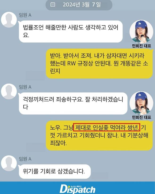 A씨는 지난해 8월 민희진의 직장 내 괴롭힘(폭언)과 부대표의 성희롱 사건 편파 개입 의혹 등을 제기했다.