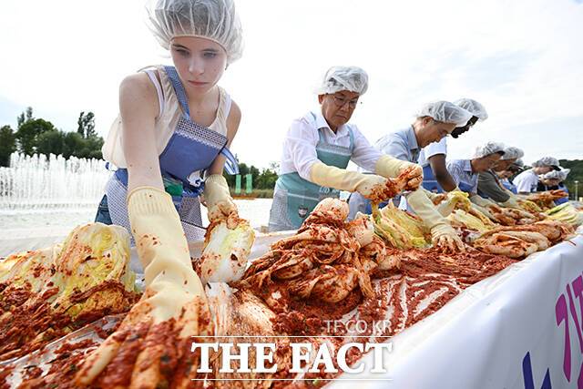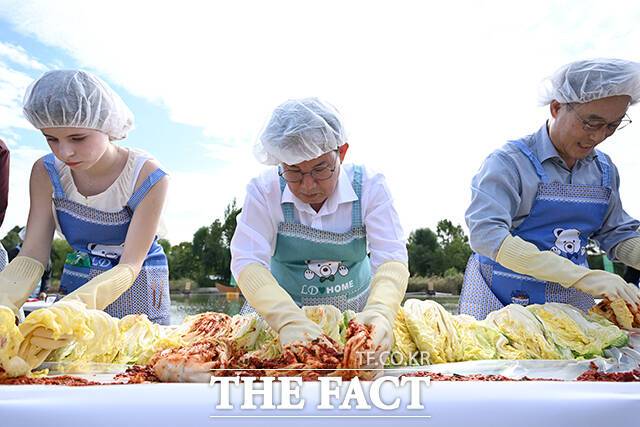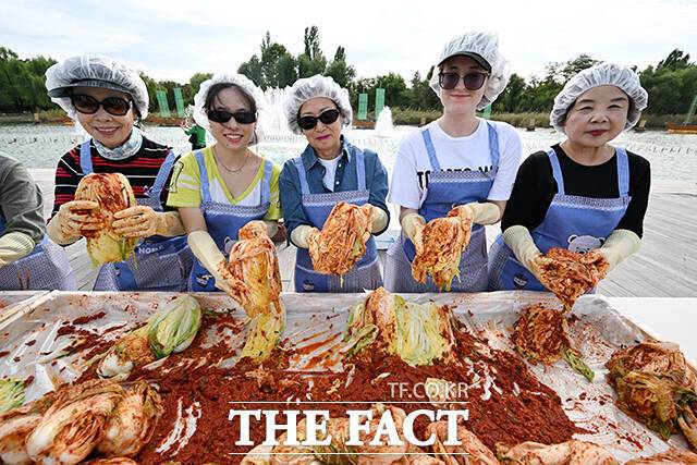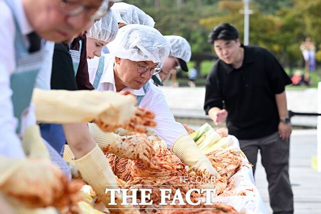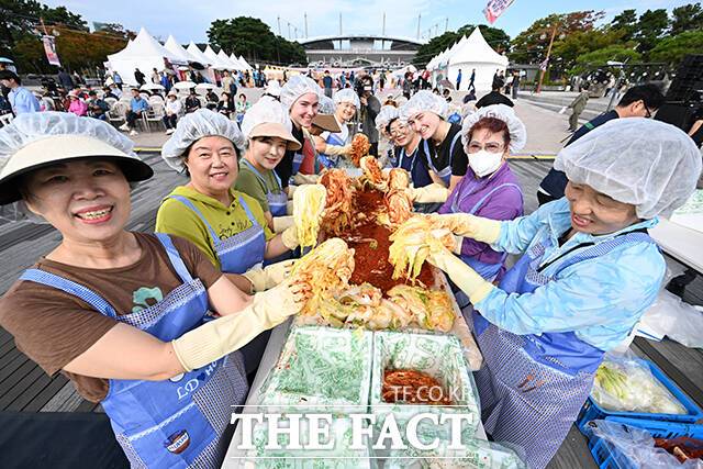 [더팩트ㅣ서예원 기자] 제18회 마포나루 새우젓축제가 17일 오후 서울 마포구 월드컵공원 평화광장 일대에서 열린 가운데 박강수 마포구청장(가운데)이 외국인들과 함께 김치 담그기 체험을 하고 있다.