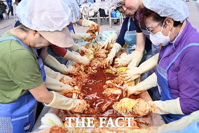 [더팩트ㅣ서예원 기자] 제18회 마포나루 새우젓축제가 17일 오후 서울 마포구 월드컵공원 평화광장 일대에서 열린 가운데 박강수 마포구청장(가운데)이 외국인들과 함께 김치 담그기 체험을 하고 있다.