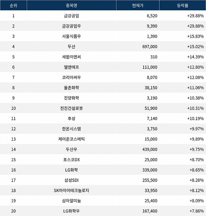 이어 상승률 2위 금강공업우(014285)는 주가가 +29.88% 폭등하며 종가 9,390원에 상승 마감했다. 상승률 3위 서울식품우(004415)의 주가는 1,390원으로 +15.83% 급등하며 부진했다. 상승률 4위 두산(000150)은 +15.02% 급등하며 697,000원에 마감했다. 상승률 5위 세원이앤씨(091090)는 +14.39%의 상승세를 타고 종가 310원에 마감했다.