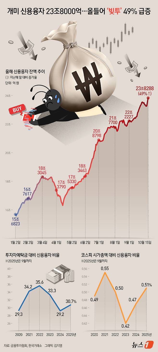 [오늘의 그래픽] 개미 신용융자 23조8000억…올들어 '빚투' 49% 급증