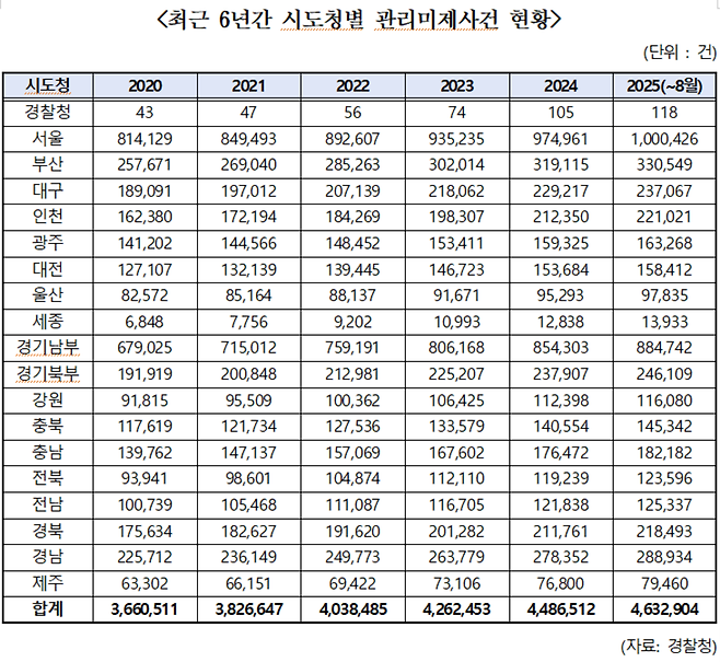 시·도청별로는 서울청이 2020년 81만4,29건에서 2025년(8월) 100만426건으로 5년 새 22.9% 증가했고, 같은 기간 경기남부청은 67만9025건에서 88만4742건으로 껑충 뛰었다.