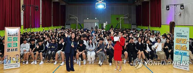 (광주=연합뉴스) 17일 광주 북구 각화동 각화중학교에서 열린 기아 챌린지 드림토크 콘서트에서 '미친 꿈에 도전하라'는 주제로 강연에 나선 여행작가 김수영씨와 학생들이 기념사진을 촬영하고 있다. 기아 오토랜드 광주는 청소년들의 꿈과 도전을 응원하기 위해 지역 중·고등학교에 전문가를 초청해 강연하는 연중 사회공헌 활동을 펼치고 있다. 2025.10.17 [기아 오토랜드 광주 제공. 재판매 및 DB 금지]