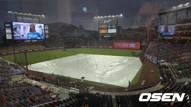 '큰일이다. 비 굵어졌다' 결국 대형방수포 덮었다...PO 1차전 우천 취소될까