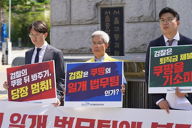 | ▲ 검찰 쿠팡물류센터 노동자 퇴직금 불기소 처분 규탄 기자회견 2025년 7월 10일 검찰 쿠팡물류센터 노동자 퇴직금 불기소 처분 규탄 기자회견 |