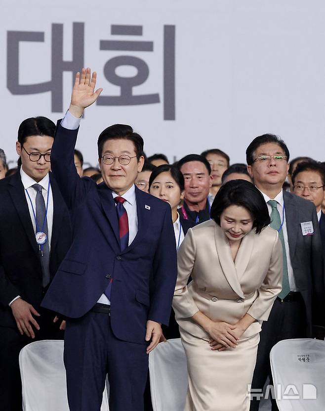 [서울=뉴시스] 최동준 기자 = 이재명 대통령과 김혜경 여사가 17일 부산아시아드주경기장에서 열린 제106회 전국체육대회 개막식에 입장하며 인사하고 있다. (대통령실통신사진기자단) 2025.10.17. photocdj@newsis.com