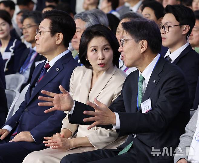 [서울=뉴시스] 최동준 기자 = 김혜경 여사가 17일 부산아시아드주경기장에서 열린 제106회 전국체육대회 개막식에서 박형준 부산시장과 대화하고 있다. (대통령실통신사진기자단) 2025.10.17. photocdj@newsis.com