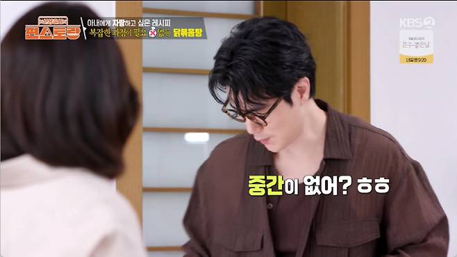 조리 과정이 복잡한 일반 레시피와 달리 '순정셰프 닭볶음탕'은 다르다고. 김강우는 "복잡한 과정이 없이 만들 수 있는 요리다"라며 자신감을 드러냈다.