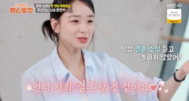 또한 한 지인을 향해서는 “저를 결혼시킨 은인이다. 저한테 ‘진짜 좋은 사람이다. 만나봐라’라고 했고 남편에게도 들어보니 언니가 나를 무작정 만나 보라고 했다고 하더라”고 남편과 소개팅을 주선한 지인이라고 말했다.