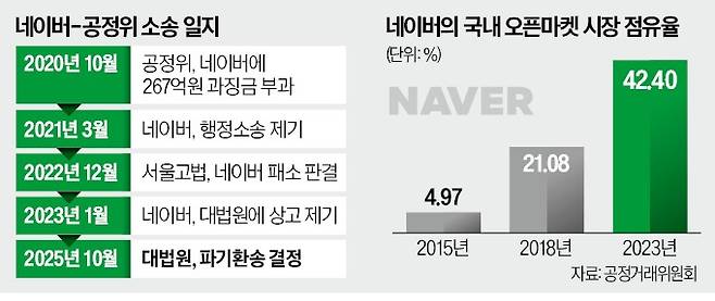 17일 법조계에 따르면 대법원은 전날 네이버가 공정위를 상대로 제기한 ‘시정명령 및 과징금 납부명령 취소’ 소송 상고심에서 파기·환송을 결정하고 사건을 2심 서울고등법원으로 돌려보냈다. 서울고법은 2022년 12월 공정위가 부과한 제재 처분이 정당하다며 네이버 패소 판결을 내린 적이 있다. 고법 판결 이후 3년 만에 대법원이 사건을 다시 따져야 한다는 취지의 판결을 내린 것이다.