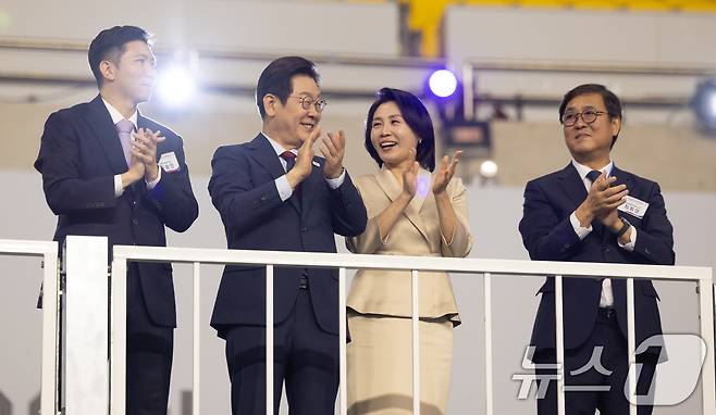 (서울=뉴스1) 허경 기자 = 이재명 대통령과 김혜경 여사가 17일 부산아시아드주경기장에서 열린 제106회 전국체육대회 개막식에서 선수단 입장을 지켜보며 박수를 치고 있다. (대통령실 제공. 재판매 및 DB 금지) 2025.10.18/뉴스1