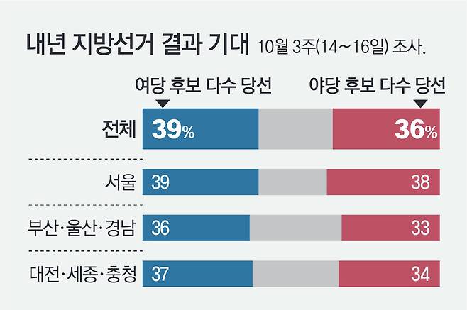 “내년 지방선거 與승리 기대” 39% vs “野 많이 당선돼야” 36%