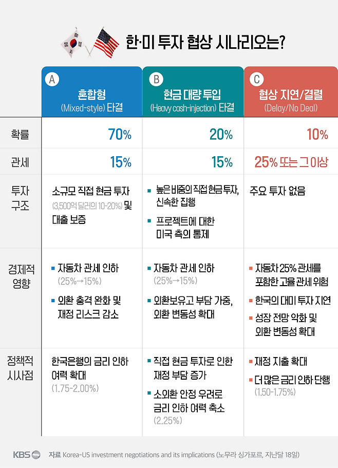 이 혼합형 시나리오는, 한국이 현금 투자를 최소 350억 달러, 최대 700억 달러로 깎고 나머지를 대출 보증으로 소화하면서 미국과 협상을 타결하는 안입니다.