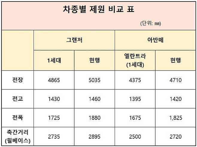 특히, 2열 공간을 좌우하는 휠베이스의 경우 1세대 그랜저가 오늘날 현대차 준중형 세단 '아반떼' 7세대 모델(2720㎜)과 비슷한 수준이다.