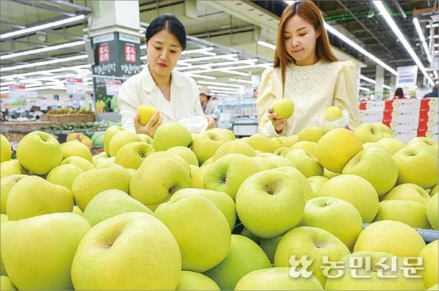 농협유통은 2025년산 ‘시나노골드’ 사과를 판매한다고 16일 밝혔다. 껍질이 금색에 가까운 노란색이라 ‘황금사과’라고도 불리는 ‘시나노골드’ 사과는 ‘골든딜리셔스’ 품종에 ‘천추’ 품종을 교배해 육성했다. 농협유통 서울 양재점 관계자들이 과일 매대에서 올해산 ‘시나노골드’ 사과를 살펴보고 있다.
