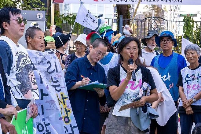 | ▲ 마이크를 잡고 길 위의 동료들과 함께 목소리를 낸다. |