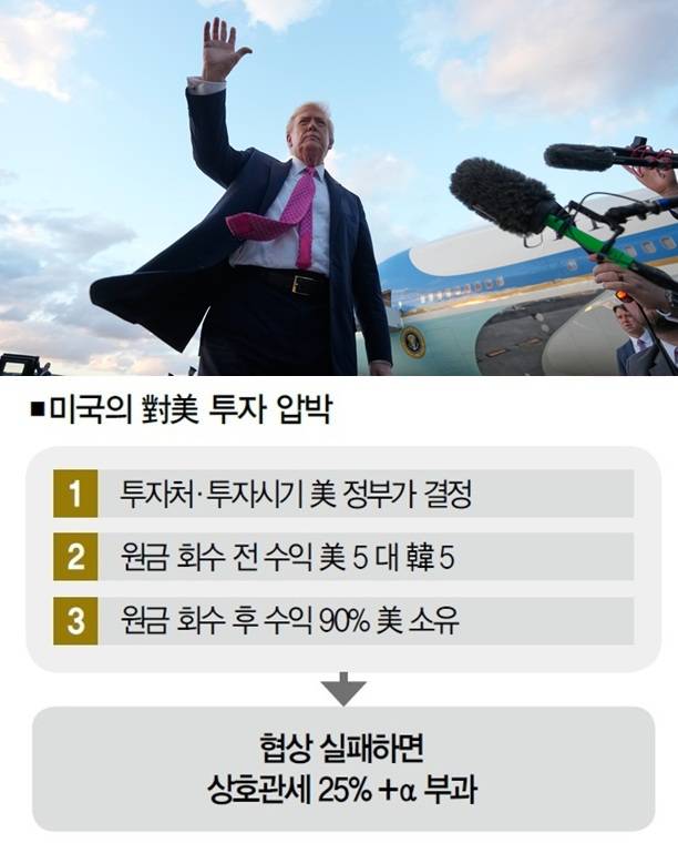 ■트럼프發 선불 요구 = 무엇보다 미국은 3500억 달러를 선불 형식으로 직접 투자해야 한다는 뜻을 굽히지 않았다. 도널드 트럼프 대통령은 9월 26일(현지시간) 백악관에서 "한국에서는 3500억 달러를 받는다"며 "이것은 선불(up front)"이라고 말했다. 미국이 사실상 우리나라에 일본식 '백지수표 투자'를 요구한 셈이다.