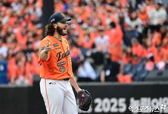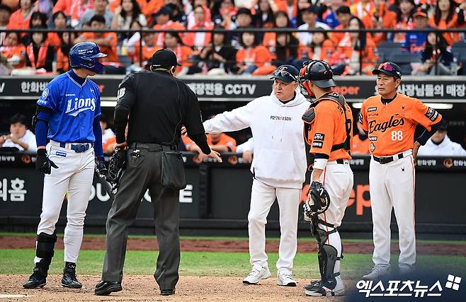 한화 김경문 감독도 그라운드로 나와 구심에게 폰세의 피치클락 활용 정당성에 대해 어필했다.