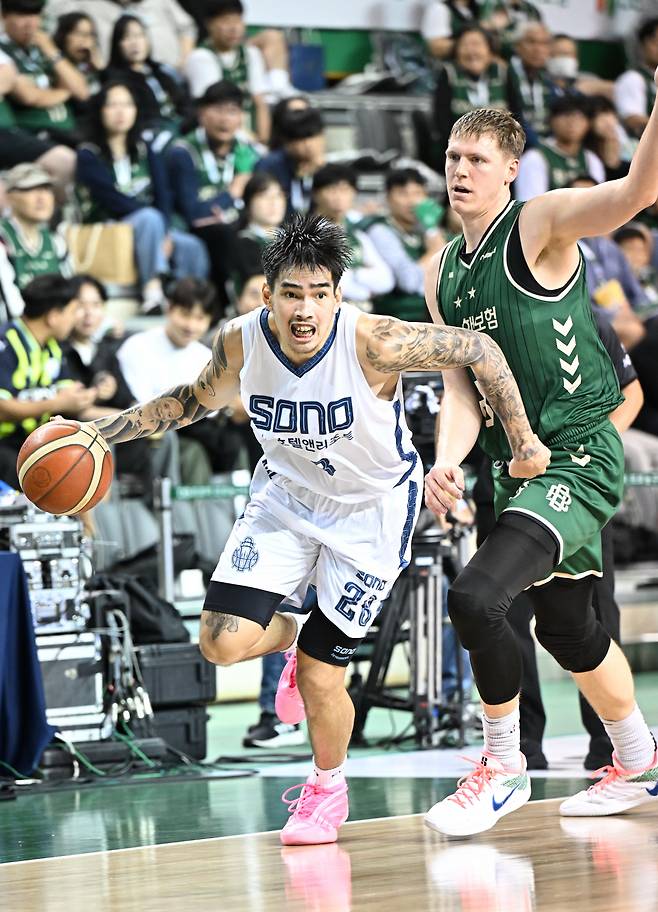 이날 경기는 소노가 먼저 웃었지만, DB가 마지막에 웃은 대결이었다. 상대적 전력 약체로 꼽힌 소노의 투지가 경기 초반부터 빛을 발했다. 소노 외국인 선수 네이던 나이트가 리바운드로 골밑을 든든하게 지켜주는 가운데 아시아쿼터 케빈 켐바오가 주 득점원으로 소노의 슴통을 텄다.