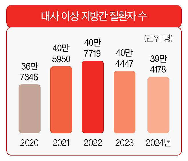 간 질환은 대부분 ‘지방간’에서 시작된다. 간 무게의 5% 이상이 지방으로 뒤덮이면 지방간을 진단받는다. 이 상태에서 염증이 생기면 ‘지방간염’이 되고, 염증이 반복돼 악화하면 간이 딱딱하게 굳는 ‘간경변증’으로 진행한다. 이때 간암이 발생할 확률은 급격히 높아진다. 가랑비에 옷 젖듯 서서히 손상돼 간경변이나 간암으로 이어지는 수순이 일반적이다. 흔히 술을 주범으로 생각하지만, 최근에는 술을 마시지 않아도 지방간이 생기는 대사 이상 지방간 질환(MASLD)이 늘고 있다.