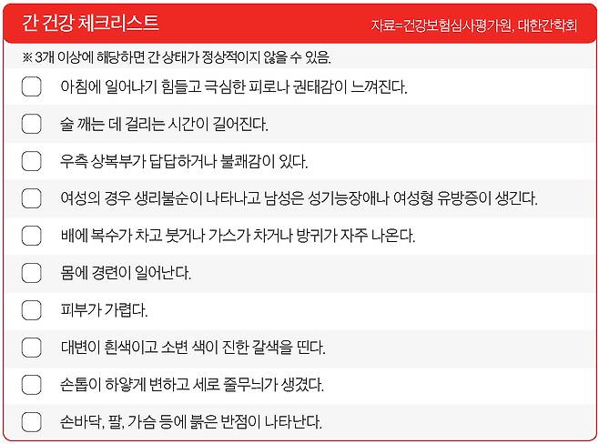 간 질환이 무서운 이유는 전조 증상이 없어서다. 겉으로는 거의 변화가 없다. 간혹 피곤하고 소화가 잘 안 되는 정도다. 간 기능이 절반 이상 떨어질 때까진 특별한 이상을 느끼기 어렵다. 간이 심하게 손상됐을 때 나타나는 증상은 황달이 대표적이다. 담즙의 구성 성분인 빌리루빈이 체내에 과도하게 쌓여 피부나 눈의 흰자가 누렇게 변한다. 대변과 소변 색도 진해진다. 이 시기엔 손바닥이 붉어지고, 심한 가려움증이나 입 냄새가 동반되기도 한다.