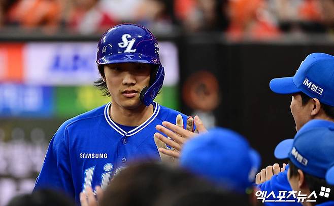 (엑스포츠뉴스 대전, 박지영 기자) 18일 오후 대전한화생명볼파크에서 열린 '2025 신한 SOL Bank KBO 포스트시즌' 삼성 라이온즈와 한화 이글스의 플레이오프 1차전 경기, 9회초 삼성 선두타자 이재현이 한화 김서현 상대로 솔로 홈런을 때려낸 뒤 더그아웃에서 동료들과 하이파이브를 나누고 있다.
