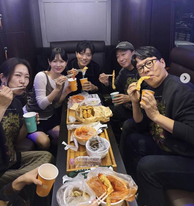 버스에서 떡볶이 만두 김밥 등으로 먹으면서 이동하는 배우들의 얼굴에는 미소가 가득한 모습.