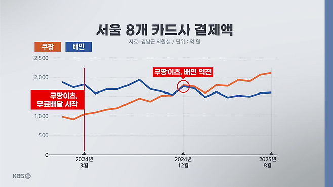 지난해 초 배달의민족의 절반 수준이던 쿠팡이츠 결제액은 지난해 3월 무료 배달 시작 직후, 가파른 성장세를 보이다 9개월 만에 배민을 앞질러 1위로 올라섰습니다.