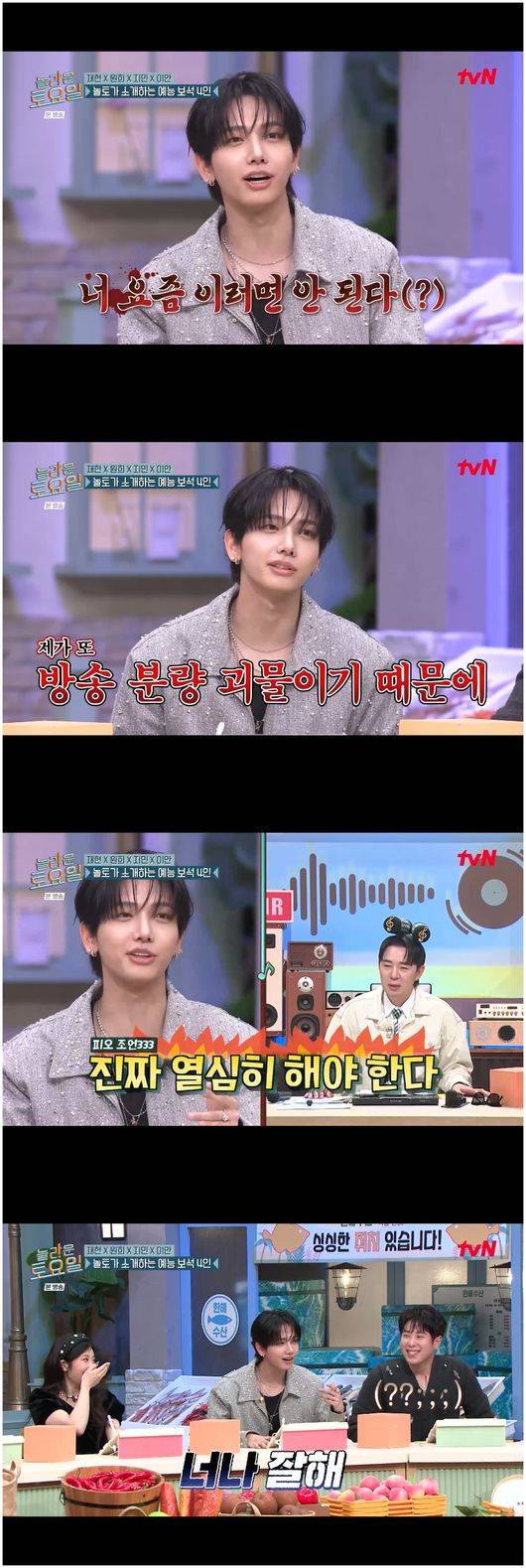 붐은 “다들 데뷔한 지 1년 차가 된 사람들이다. 우리 놀토가 7년 차인데, 본받고 싶은 선배들이 있냐”라고 물었다. 데뷔가 가장 오래 된 명재현은 “저는 피오 선배님이다. 피오 선배님이 전화할 때마다 ‘너 요즘 이러면 안 된다’라고 하신다”라고 말했다. 그는 “나아가야 한다”, “더 열심히 해야 한다”라며 피오의 격언 멘트를 전했다.