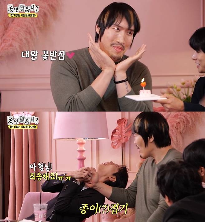 주우재는 깐족대며 썸녀가 실존하는지 질문을 던졌고, 폭발한 최홍만이 “까불지 마”를 외치며 주우재에게 응징을 가했다.
