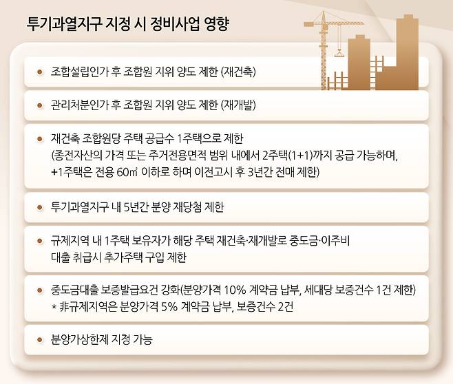 서울 및 경기도 과천, 성남, 용인, 수원, 광명, 안양, 의왕, 하남에 있는 정비사업지는 규제지역으로 지정됨에 따라 조합원 지위양도 제한, 재당첨 제한, 조합원 공급 주택수 제한 등의 규정을 적용받는다.