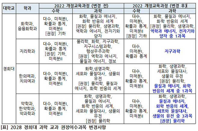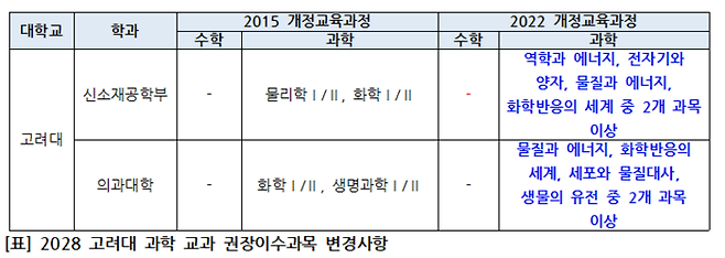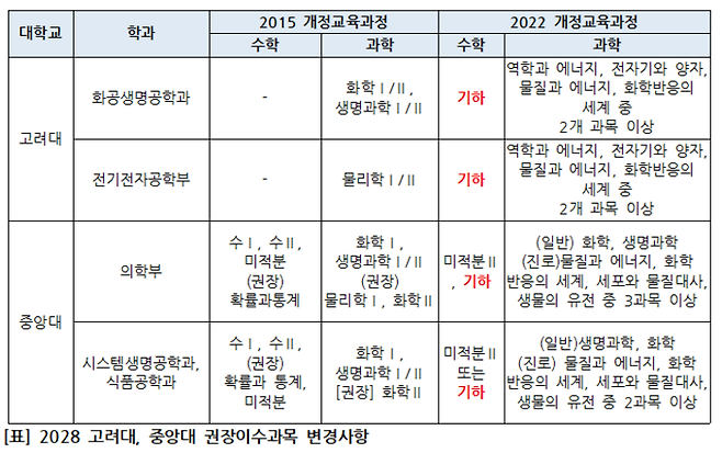 예를 들어 고려대 화공생명공학과와 전기전자공학부는 기존 2015 교육과정 땐 수학을 권장이수과목으로 두지 않았습니다. 이후 2022 개정 교육과정에서 기하를 권장이수과목으로 새로 포함시켰습니다.
