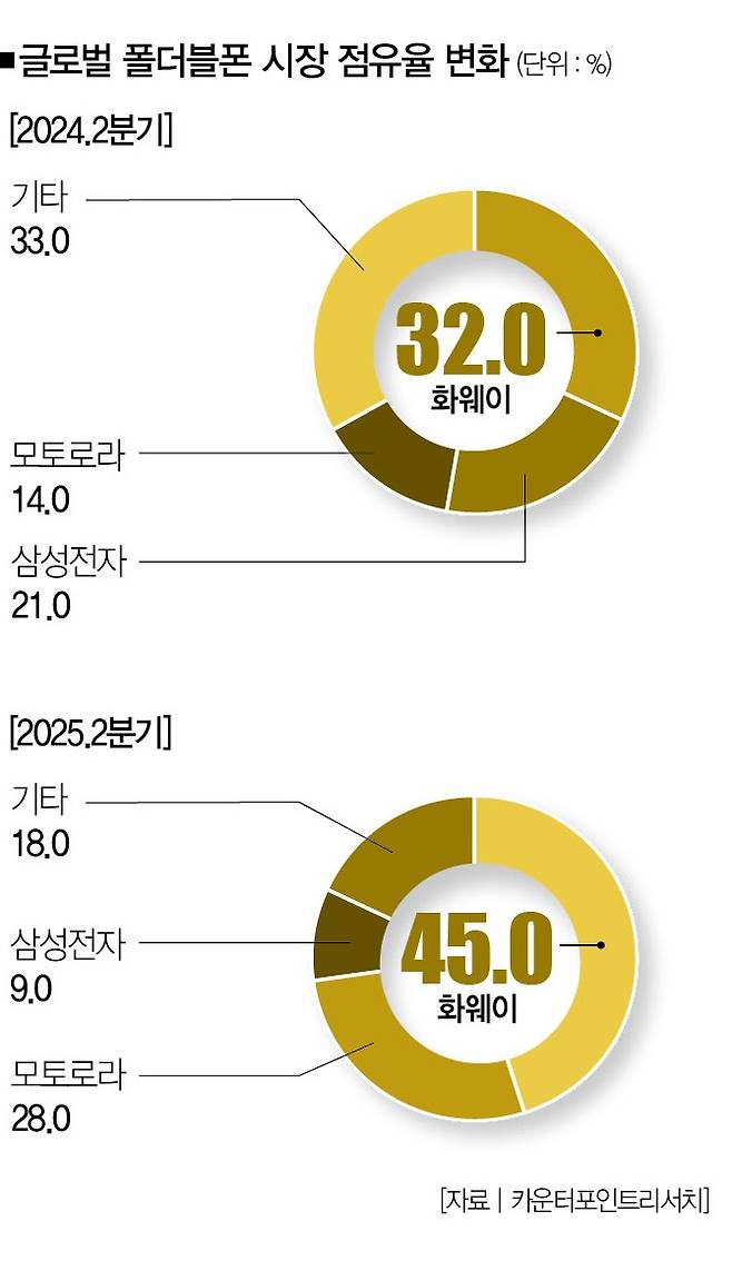 그로부터 6년이 흐른 2025년, 모토로라의 상황은 어떨까. 이번에도 답은 '의외'다. 시장조사업체 카운터포인트리서치가 지난 9월 발표한 자료에 따르면, 모토로라의 글로벌 폴더블폰 시장 점유율은 2024년 2분기 14.0%에서 올해 2분기 28.0%로 껑충 뛰어올랐다. 화웨이(45.0%)에 이은 2위로, 같은 기간 점유율이 21.9%에서 9.0%로 쪼그라든 삼성전자를 보란 듯이 압도했다.