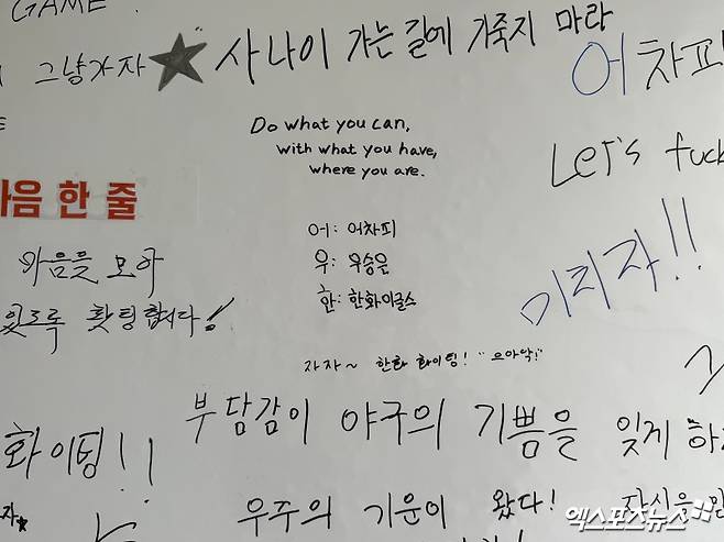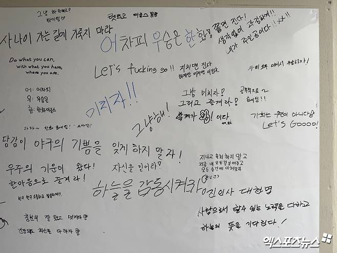 "늘 그랬듯이", "우리가 그동안 해왔던 대로" 마음가짐을 다잡기도 하고, "지치면 진다, 하지만 미치면 이긴다", "그냥 미치자" 외치며 온 힘을 쏟아부을 것을 다짐했다. "어차피 우승은 한화 이글스", "우주의 기운이 왔다"는 믿음도 보였다. 볼보이들도 "저희도 열심히 방망이 나르겠슴다"라고 적으며 귀여운 응원을 보냈다.