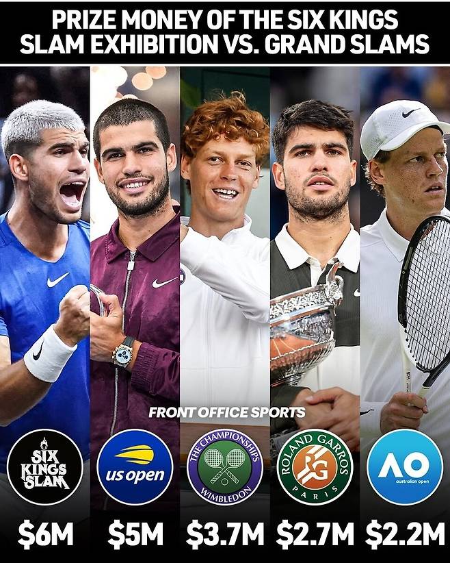 이번 대회 총상금은 1350만달러(192억원). 출전선수 6명은 참가비로만 150만달러(21억원)를 받았습니다. 그러나 ATP 정규 투어 대회가 아니라 랭킹포인트는 부여되지 않았습니다.