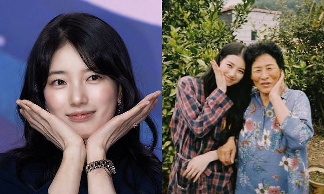 해당 사진 속에는 드라마 촬영장 근처에 위치한 외가댁을 찾아 외할머니와 다정하게 팔짱을 낀 채 꽃받침 포즈를 취하고 있는 수지의 모습이 보인다.