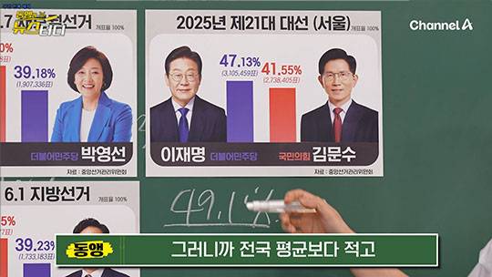 그러다가 작년 총선 때 바뀌어요. 지금 민주당이 훨씬 많죠. 서울에서 의석수가 37석, 국민의힘은 11석입니다. 올해 대선은 어땠을까요? 올해 대선 때 보면 이재명 대통령이 전국에서 49.1%를 얻었거든요. 그런데 서울에서 얻은 표 수는 47.13%로 좀 적죠. 그러니까 전국 평균보다 적고 경기도와 인천은 50% 넘게 받거든요. 확실히 경기나 인천보다는 서울이 민주당 세가 좀 약한 거는 맞는 것 같습니다. 게다가 김문수 후보와 이준석 후보 표까지 합치면 이재명 대통령보다 더 많은 표를 얻기도 합니다.