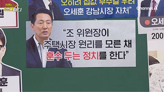 그러면서 또 한 명 얘기가 나오는 게 조국 비대위원장입니다. 계속 오 시장 쪽에 싸움을 걸었어요. 조국 위원장이 먼저 "서울시가 추진하는 강남벨트 중심의 정책은 오히려 집값을 부추길 우려가 있다. 오세훈은 강남 시장이냐"고 합니다. 오 시장이 부동산 드라이브를 걸면서 한강 벨트, 강남 쪽도 집을 많이 지어야 된다라고 하니까 조국 위원장은 “오히려 강남 벨트로 개발하면 거기는 어차피 돈 많은 사람만 사는 거라 서민들은 더 못 산다”고 비판하는 겁니다.
