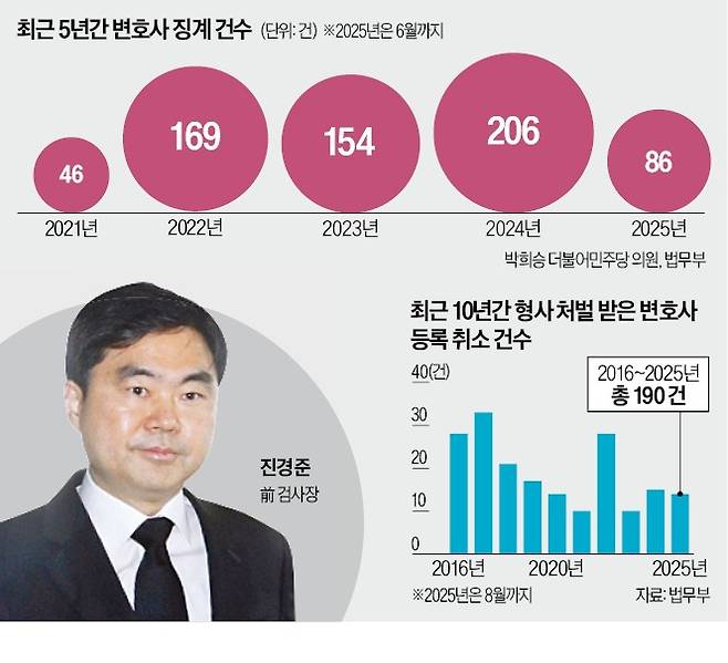 최근 변호사 징계 건수가 급증하는 가운데 사법 신뢰 회복을 위해 심사위를 강화해야 한다는 주장도 나온다. 2021년 46건이던 변호사 징계 건수는 지난해 206건으로 네 배 이상 증가했다.