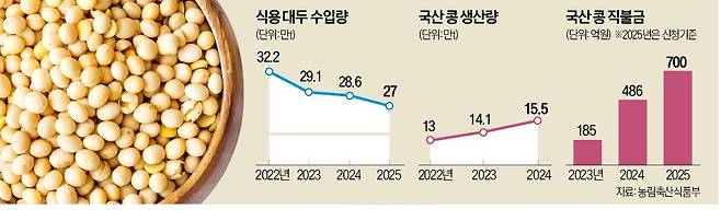 농식품부에 따르면 이달 기준 올해 수입 콩 공급량은 27만t 수준이다. 지난해에 비해 1만6000t 적다. 남아도는 국산 콩 사용을 장려하기 위해 정부가 대두 수입을 줄이고 있어서다. 내년엔 콩 수입량을 더 감축할 방침이어서 공급난은 한층 심해질 전망이다. 농식품부 관계자는 “올해보다 수입 콩 쿼터를 더 줄이는 대신 대기업 등 상위 업체를 중심으로 국산 콩 사용을 유도하는 방안을 검토하고 있다”고 말했다.